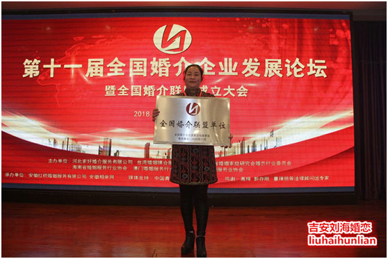 2018年11月21-22日劉?;閼賱⒖偢昂戏蕝⒓拥?1屆全國(guó)婚介企業(yè)發(fā)展論壇暨全國(guó)婚介聯(lián)盟大會(huì),吉安劉海婚戀成為全國(guó)婚戀聯(lián)盟單位,一處信息,全國(guó)共享。